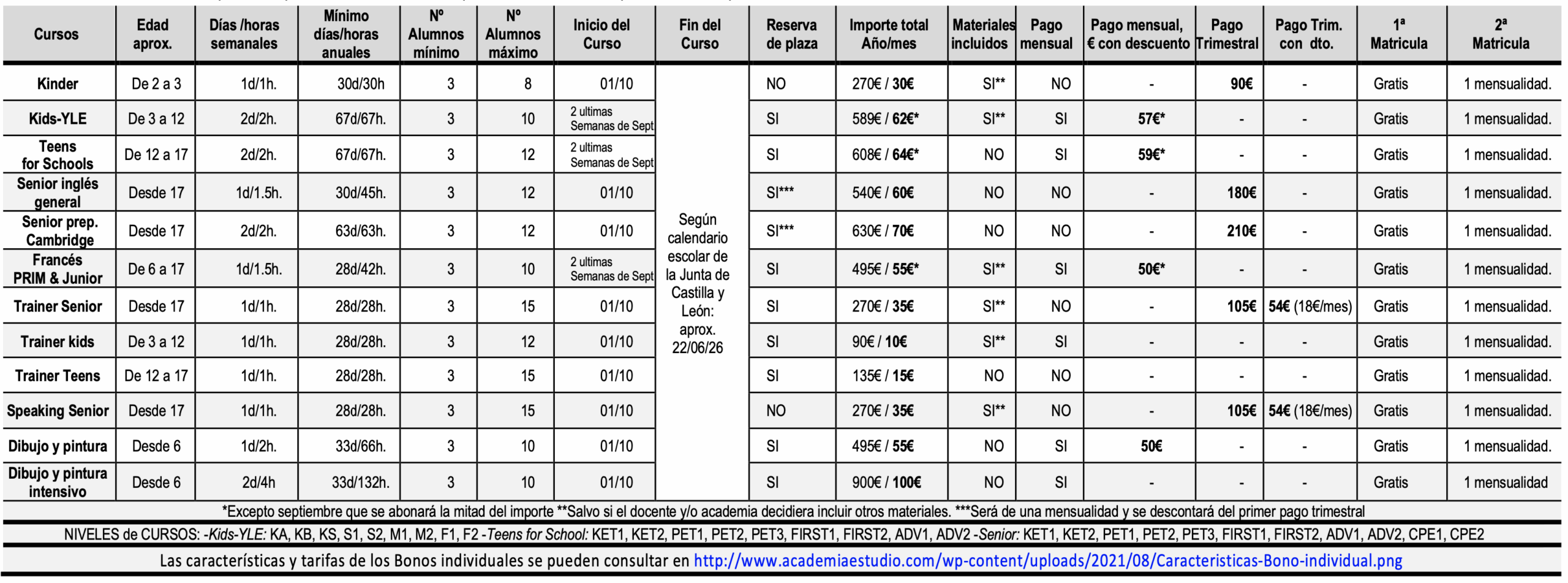 • Características de los cursos: Enseñanza no reglada/Otras enseñanzas. Especialistas en la enseñanza de inglés, francés y dibujo y pintura.